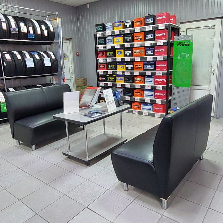Приятно удивили работой: колеса поменяли оперативно, старые аккуратно упаковали и сложили в багажник. Видно, что мастера работают профессионально. Есть удобная зона ожидания с экраном - можно наблюдать за процессом.
