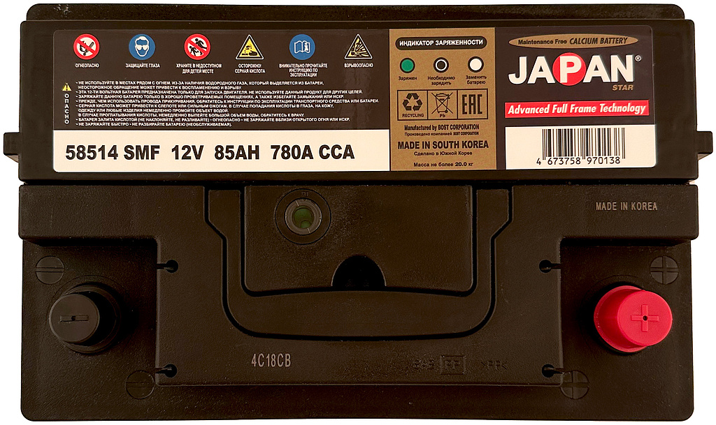 АКБ JAPAN STAR SMF — прочный и надёжный аккумулятор, который обеспечивает уверенный запуск двигателя и стабильную работу всех электрических систем автомобиля на протяжении многих лет.