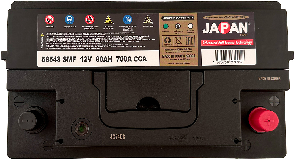 АКБ JAPAN STAR SMF — прочный и надёжный аккумулятор, который обеспечивает уверенный запуск двигателя и стабильную работу всех электрических систем автомобиля на протяжении многих лет.