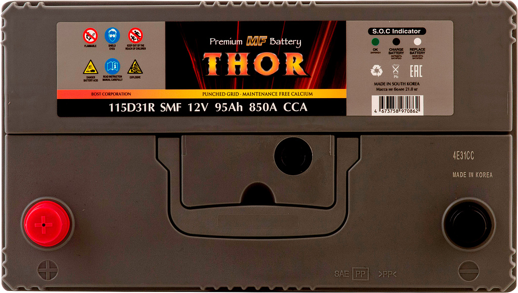 Автомобильный аккумулятор THOR SMF — серия аккумуляторов премиум-класса, выпускаемая заводом BOST CORPORATION (Южная Корея). Производитель применяет запатентованные технологии и материалы высокого качества, обеспечивая стабильную работу и продолжительный срок службы батарей.