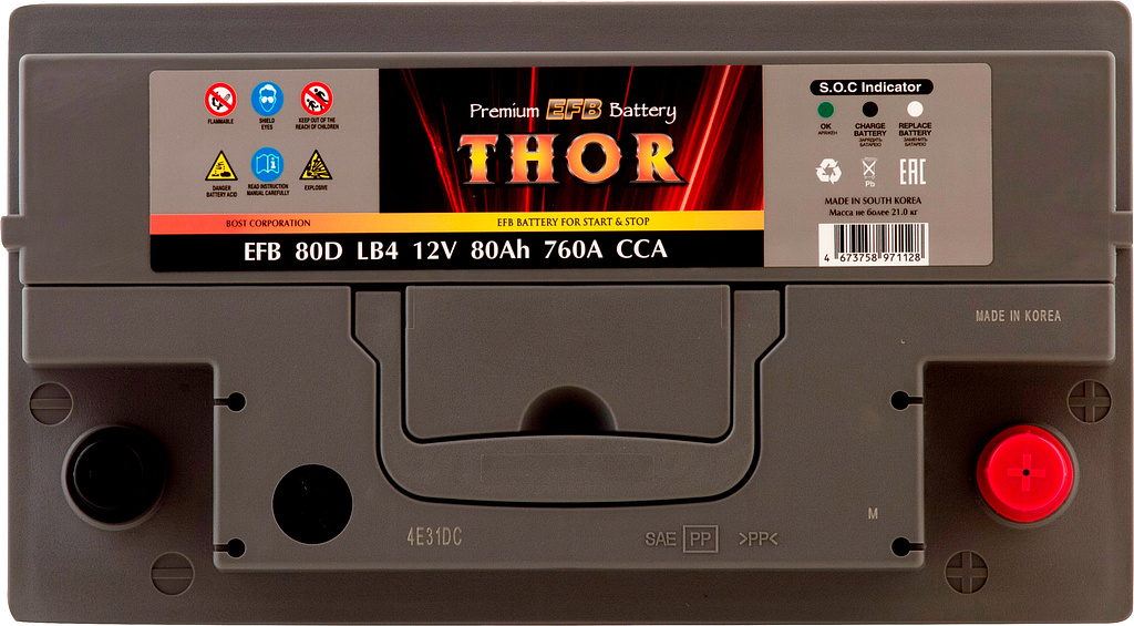 Аккумуляторы THOR EFB — это современная линейка, разработанная и произведённая компанией BOST CORPORATION (Южная Корея). Они предназначены для автомобилей, оснащённых системой Start-Stop, и отличаются повышенной устойчивостью к циклическим нагрузкам.