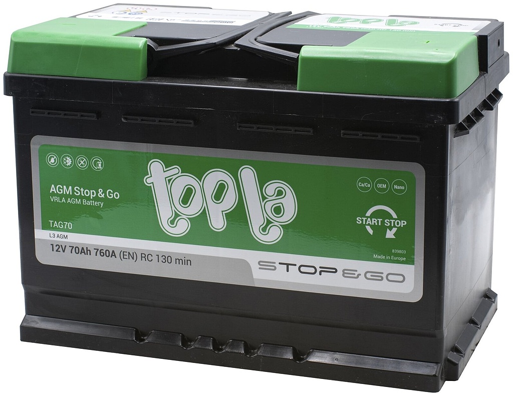Аккумулятор Topla AGM Stop&Go производится в Словении на заводе концерна TАВ (г. Межица). Используемая технология AGM (Absorbent Glass Mat) — это современный подход в производстве свинцовых автомобильных аккумуляторов, который обеспечивает высокую надежность и долговечность. Электролит в таком аккумуляторе связан в сепараторе из стекловолокна, что гарантирует равномерное давление на активный материал и минимизирует потери.