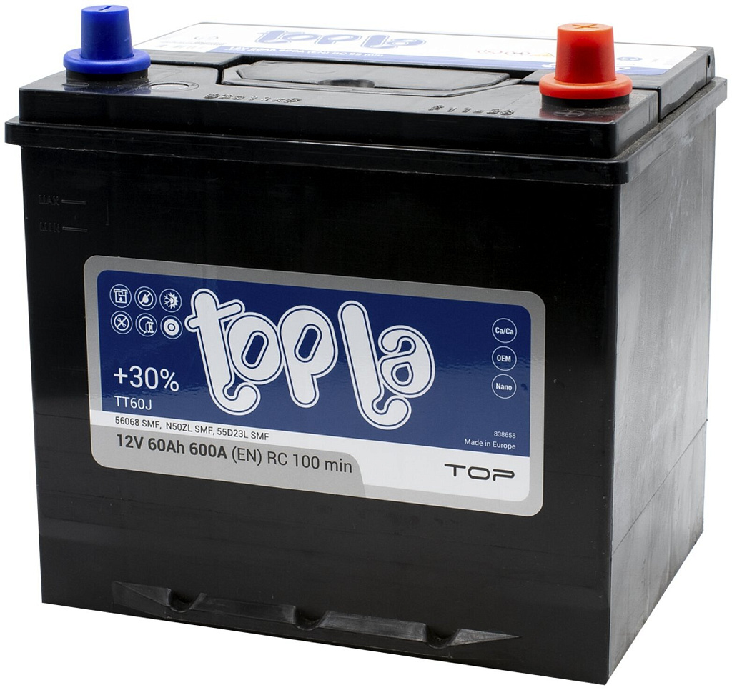 Автомобильный аккумулятор Topla Asia Top (Top Sealed JIS) производится в Словении на заводе концерна TАV (г. Межица). Эта аккумуляторная батарея относится к полностью необслуживаемым и сохраняет стабильные характеристики в течение всего срока эксплуатации.