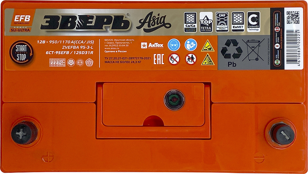 Аккумулятор ЗВЕРЬ Asia EFB 95 Ач 950 А прямая полярность